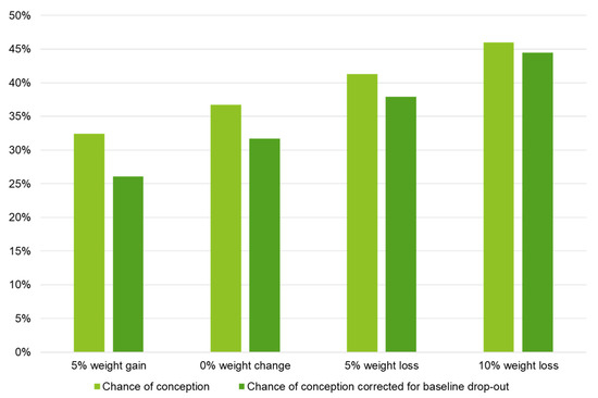 Logistic regression model for the effect of changes in weight on the chance of conception ≤ 24 months after the start of the intervention resulting in live birth. Note: Results are based on calculations by the Erasmus MC using non-public microdata from Statistics Netherlands. Logistic regression analyses; chance of conception: B = −0.038 SE 0.028, p = 0.169; chance of conception corrected for baseline drop-out: B = −0.055 SE 0.031, p = 0.081.