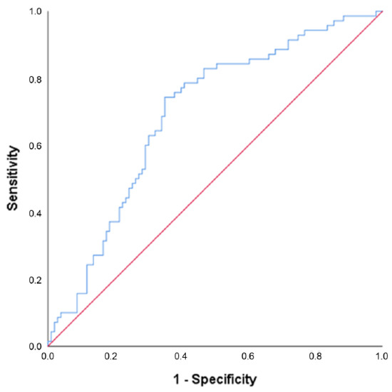 Twelve potentially predicting baseline variables, further specified in Table 3, were identified and joined in a multivariate model. The stepwise elimination process resulted in a model in which time attempting to conceive before the start of the study (OR 0.984 (95% CI 0.972–0.997), p = 0.017) and insulin (OR 0.991 (95% CI 0.986–0.997), p = 0.003) at baseline both had a negative predictive value for conception resulting in live birth within 24 months after the start of the intervention (see Table 3). The ROC curve for the final model is displayed in Figure 4 with an area under the curve of 0.691 (p < 0.001).