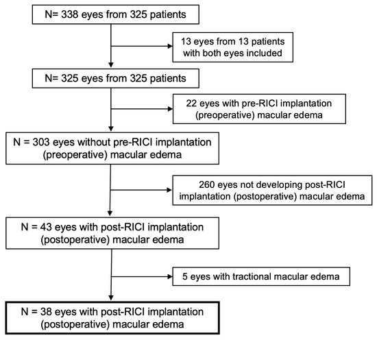 Data were collected from 338 eyes of 325 patients who underwent PPV and RICI implantation during the previously mentioned timeframe in the participating centers. In cases of bilateral surgery, only the first eye included in the study was considered for analysis, so 13 eyes were excluded from the first analysis. After RICI implantation and PPV, 65 eyes developed ME at some point during follow-up. For final analysis, 22 eyes with preoperative ME (pre-RICI implantation) and 5 eyes with tractional ME due to previous epiretinal membrane were not considered. A total number of 38 eyes with postoperative, not tractional ME, were finally analyzed (Figure 1).