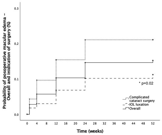 Postoperative macular edema development. Cumulative probability of postoperative macular edema (ME) in the overall cohort (solid line), eyes coming from a complicated cataract surgery (dotted line) and eyes coming from an intraocular lens (IOL) luxation (striped line). *: Statistical significance.
