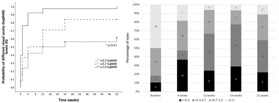 Visual acuity outcomes. Left: Cumulative probability of achieving different visual acuity (VA) levels from baseline (dotted line: VA ≤ 0.3 logMAR; striped line: VA ≤ 0.7 logMAR and solid line: VA ≤ 1.0 logMAR). Right: Distribution of eyes in each VA group at different timepoints during follow-up (black: VA ≤ 0.3 logMAR; dark grey: VA > 0.3–0.7 logMAR; medium grey: VA > 0.7–1.0 LogMAR, light grey: VA > 1.0 LogMAR). *: Statistical significance.