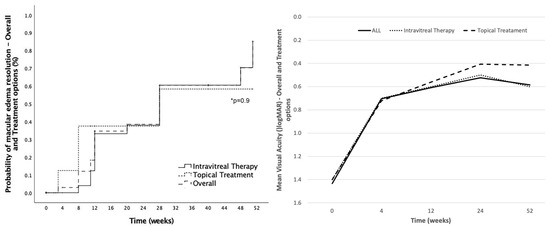 Intravitreal therapy was used in 68.4% (26/38) of the eyes with postoperative ME. The DEX implant was the elected treatment in 50% (19/38) of the cases. As demonstrated in EPISODE-1 and -2 studies, the DEX implant is an effective and safe treatment for postsurgical ME [15,16]. In our cohort, we described a cumulative probability of postoperative ME resolution after IT (most of them were patients treated with DEX implant) of 85.2%. These results, in comparison with the ones obtained with the topical treatment (58.3%), have to be contextualized. As previously mentioned, a treatment selection bias may have been applied as a topical treatment could have been used in milder ME cases. However, despite being milder cases, the lower final rate of complete resolution of postoperative ME in these eyes may be a consequence of tolerating small amounts of residual ME with preserved VA in some of the study eyes that received a topical treatment during follow-up.