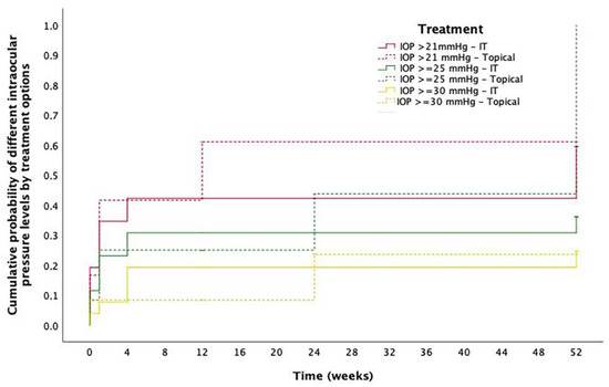 Intraocular pressure outcomes. Cumulative probability of different levels of intraocular pressure (IOP) at different timepoints in eyes with postoperative macular edema sorted by treatment option. Red solid line: Cumulative probability IOP > 21 mmHg in eyes treated with intravitreal therapy (IT); Red striped line: Cumulative probability IOP > 21 mmHg in eyes treated with topical treatment; Green solid line: Cumulative probability IOP ≥ 25 mmHg in eyes treated with IT; Green striped line: Cumulative probability IOP ≥ 25 mmHg in eyes treated with topical treatment; Yellow solid line: Cumulative probability IOP ≥ 30 mmHg in eyes treated with IT; Yellow striped line: Cumulative probability IOP ≥ 30 mmHg in eyes treated with topical treatment.