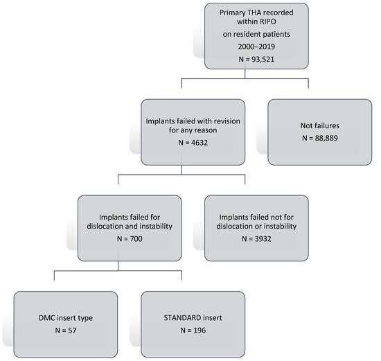 A total of 700 implants that failed for dislocation and instability which required revision surgery were collected (Figure 1); of those, 253 implants with only cup revision performed in 19 years were included in the study. Revisions were divided for the implants: DMC and standard cup. The following data were considered: sex, age at surgery, BMI, femoral head size for standard insert, dual mobility insert, revisions implant survival rates at 5- and 10-years of follow-up. The selected population was divided into two groups based on insert type: standard and DMC, with 196 and 57 implants, respectively. During the period 2000–2019, a total of 57 DMC were used in revision THAs, the most used being Trident PSL HA Cluster (n = 8; 14.0%), SAINT-GENIX FH ORTHOPEDICS (n = 6; 10.5%), POLARCUP ORTHO-ID (n = 4; 7.0%), AVANTAGE 3P BIOMET (n = 4; 7.0%), TRIDENT PSL HA CLUSTER STRYKER ORTHOPAEDICS (n = 3; 5.3%), AVANTAGE CEMENTED BIOMET (n = 3; 5.3%), and DMX TRANSYSTEME (n = 3; 5.3%); other implants were used in two or less patients each (n = 24; 42.1%). Standard implants where the femoral head was revised were divided according to the femoral head size: ≤28 mm, 32 mm, and ≥36 mm.