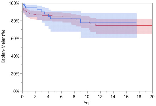 Descriptive statistics were used to summarize the data, presented as the median and mean with standard deviation (SD) for continuous variables and as the frequency with percentage (%) for categorical variables. The statistical significance was calculated using the chi-square test for qualitative data and t-test for continuous data. A p-value of <0.05 was considered statistically significant. Kaplan–Meier survivorship analysis was performed using the revision of any component as the endpoint and survival times of unrevised THAs taken as the last date of observation (31 December 2020, or date of death). The log-rank test was used to compare survivorship between the two groups. Statistical analyses were performed using SPSS 14.0, version 14.0.1 (SPSS Inc., Chicago, IL, USA) and JMP, version 12.0.1 (SAS Institute Inc., Cary, NC, USA, 1989–2007).