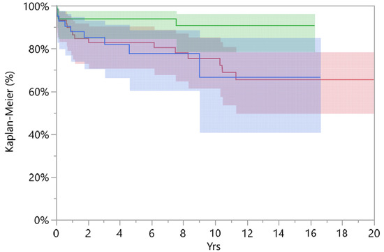Implant survival is a fundamental parameter to promote the use of a determinate implant in clinical practice. Ecker et al. [25], in his study on DMCs used in complex revision THAs, showed survival rates of 96% at 5 years (95% CI: 92 to 98) and 82% at 9 years (95% CI: 72 to 89). The overall dislocation rate was 11% (24 of 216 patients) at the final follow-up, with more revision than expected based on earlier studies on dislocations of these components. Li et al. [33], in a study on 267 cases of revision THA, found that DMCs were used more frequently in patients revised for instability compared with the standard group (8.5% vs. 1.2%, p < 0.005), and had a reduced incidence of postoperative dislocations (2.1% vs. 8.7%, p = 0.067), and no difference in the rates of re-revisions (9.6% vs. 11.6%, p = 0.770). De l’Escalopier et al. [30], in a retrospective study, found that DMCs implanted in revision THAs for dislocation had a survival rate at 7 years of 90.4 ± 5.3%. The good survival and outcomes of DMC implants promoted their use and warranted the extension of the surgical indications [15,23,27]. Our study supports this attitude and show the validity of DMC implants in the management of the recurrent dislocation of THA implants requiring revision surgery, confirming that modern implants are associated with good implant survival.