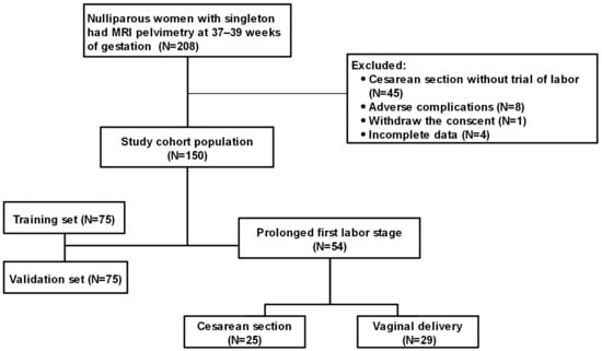 The study participant flow diagram. Nulliparous women with singleton gestation had MRI pelvimetry (excluding those with comorbidities who underwent cesarean section without trial of labour) at 37 to 39 weeks of gestation. A study cohort of 150 pregnant women was first divided into the training and validation sets, then those with a prolonged first stage of labour were classified into the cesarean section and vaginal delivery groups.