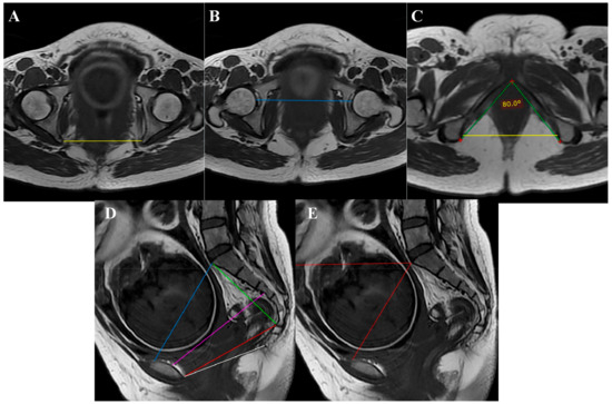 MRI pelvimetry: (A) Intertuberous distance; (B) Bilateral femoral head distance; (C) Pubic angle (green line) and interspinous distance (yellow line); (D) Obstetric conjugate (blue line), pelvic width (purple line), sacral outlet diameter (red line), outlet diameter of the pelvis (white line), and sacral length (green line); (E) Pelvic inclination (red line).