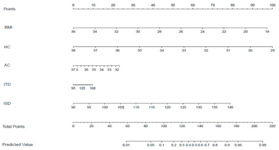 Univariable logistic regression analyses indicated factors associated with vaginal birth (Table 2), and multivariate logistic regression introduced five factors, including HC, AC, ITD, ISD, and pre-pregnancy BMI (Table 3), which we used to develop a nomogram that predicts the vaginal delivery probability (Figure 3).