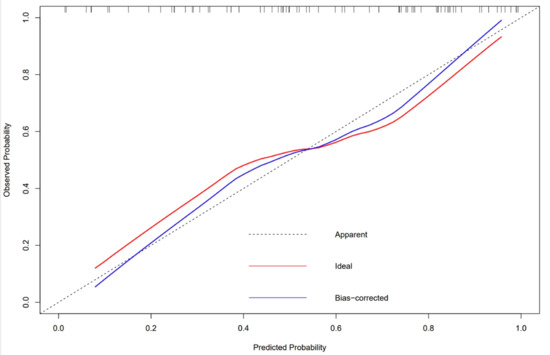 Calibration curve. The red line represents ideal predictions. The plot illustrates the accuracy of the best-fit model (Apparent) and the validation model (Bias-corrected) for predicting vaginal delivery.