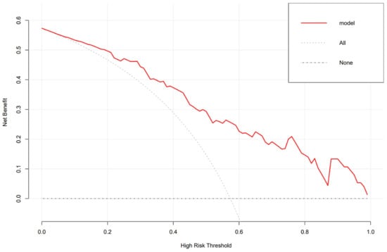 Decision curve analysis for the predictive model. The red line represents the prediction model. The gray dashed line assumes all women delivered vaginally and the horizontal line assumes no woman delivered vaginally.