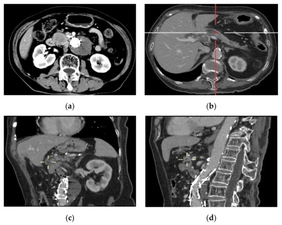 An 83-year-old female with a medical history of hypertension, hyperlipemia, and diabetes mellitus was referred to our hospital due to a pancreatic lesion identified as a solid tumor of the pancreas head by contrast-enhanced computed tomography (Figure 1). Her height, weight, and body mass index (BMI) were 172 cm, 65.3 kg, and 22.1 kg/m2, respectively. She had undergone EVAR due to AAA at the age of 73 years old. After that, she had regular follow-up visits. The AAA was located on the infrarenal aorta (Figure 1c).