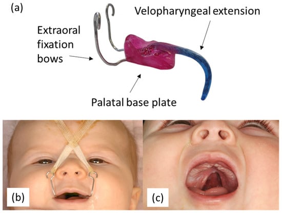 Tübingen palatal plate (TPP) orthodontic appliance: (a) construction of the TPP bases on two extraoral fixation bows, a velopharyngeal extension (blue) and a palatal base plate (pink); (b) Robin sequence patient with inserted TPP and its fixation by extraoral tapes; (c) Robin sequence patient without the inserted TPP showing the cleft palate.