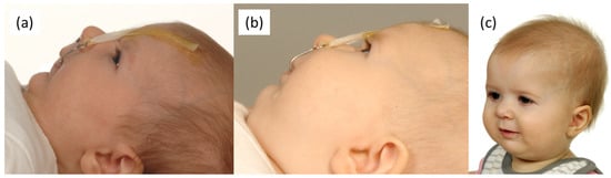 Mandibular growth development of a patient with Robin sequence treated with the Tübingen palatal plate (TPP) directly after birth: (a) facial profile after two months of TPP treatment; (b) facial profile after four months of TPP treatment; (c) patient after successful TPP treatment with eight months.
