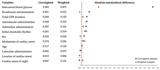 We used the statistical data from the previous study, which provided a proportion of exposed subjects of 0.284 [8]; A study size of at least 210 patients was required to achieve a two-sided alpha error of 0.05 and 80% statistical power. All data were analyzed using Stata 16 (StataCorp, College Station, TX, USA). The categorical variables were presented using numbers and percentages and analyzed using chi-squared tests. The continuous variables were presented using means and standard deviations and analyzed using student t-test statistics. A two-tailed p-value of 0.05 was used to establish statistical significance. The odds ratio (OR) was selected as the measurement endpoint. Standardized differences (STD) were employed to compare the clinical features of the two groups. An STD score of 10% or higher in either direction was considered significant and may indicate potential confounding by indication, or confounding by contraindication, at baseline [14]. We used inverse probability treatment weighting (IPTW) to adjust the imbalance of prognostic factors [15]. Firstly, we developed a multivariable logistic regression model to predict the likelihood of being administered dextrose during CPR. The propensity model contained the following elements: sex, age, time of cardiac arrest, mechanism of cardiac arrest, location of cardiac arrest, initial shockable rhythm, drugs administered during CPR, including adrenaline, amiodarone, lidocaine, and bicarbonate, total CPR duration, and the intra-arrest blood glucose level. The model prognosticated that the probabilities of being administered dextrose were used as treatment weights for the dextrose administration group. In contrast, the model predicted probabilities of not being administered with dextrose during CPR were used as treatment weights for another group without dextrose administration. To decrease the variability of the estimated treatment effect owing to extremely large weights on both ends, we performed a weight truncation at the 1st percentile and the 99th percentile [15]. We developed a balanced diagnostic plot to assess the difference in characteristics between the weighted and unweighted samples. The features with an absolute STD of more than 0.10 after accounting would be adjusted in the weighted logistic regression model for double robustness [15,16]. A weighted multivariable logistic regression was performed to assess the association between dextrose administration during CPR and the resuscitation outcomes. We analyzed the regression model separately for each endpoint.
