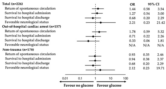 - Wongtanasarasin, W.; Ungrungseesopon, N.; Phinyo, P. Association between Intra-Arrest Blood Glucose Level and Outcomes of Resuscitation at the Emergency Department: A Retrospective Study. J. Clin. Med. 2022, 11, 3067. [Google Scholar] [CrossRef]