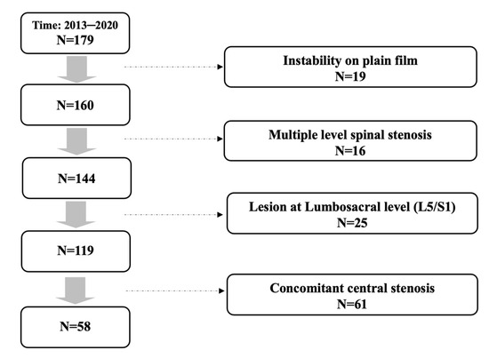 In total, 179 patients received primary single level TLIF for spinal stenosis in our institute. Among these patients, 19 with concomitant segmental instability on plain film were excluded, and 16 patients with multiple level stenosis, 25 patients with lesion at lumbosacral level, and 61 patients with concomitant central stenosis were ruled out after reviewing pre-operative MRI of every included individual. A total of 58 consecutive patients remained and were included in the study. The patient inclusion flow diagram is presented at Figure 1.