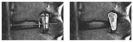 We measured several quantitative foraminal parameters using preoperative lumbar spine MRI. Foraminal height was defined as the longest distance between the superior and inferior pedicles, while posterior intervertebral disc height was the shortest distance between the adjacent endplates at the posterior half of an intervertebral disc. In addition, superior and inferior foraminal widths were defined as the maximum width of the superior and inferior parts of the foramen, respectively [14]. The foraminal area was determined using the border of perineural fat on the magnetic resonance images [15]. Figure 2 shows the methods used to measure these parameters. To standardize the measurement of the parameters, the anterior–posterior axis of the intervertebral disc (Line 0) was first identified. Subsequently, the foraminal (Line 1) and disc (Line 2) heights were determined perpendicular to Line 0, while the superior foraminal (Line 3) and inferior foraminal (Line 4) widths were measured parallel to Line 0.
