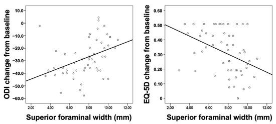 Figure 3 shows the scatter plot of superior foraminal width against change in the ODI and EQ5D from baseline. The smaller the superior foraminal width, the greater the decrease in the ODI and improvement in the quality of life (EQ-5D).