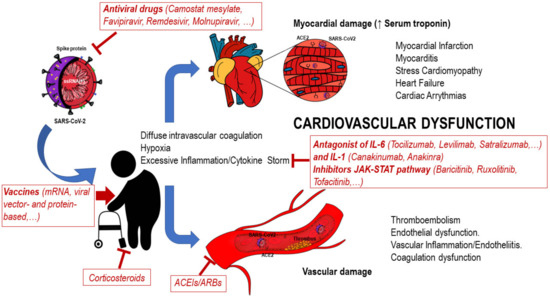 Furthermore, the hyperinflammatory response, triggered by cytokine and chemokines, observed in COVID-19 patients seems to play a key role in the pathogenesis by either revealing an undiagnosed disease or provoking direct tissue damage. Therefore, understanding the damage caused by SARS-CoV-2 to the cardiovascular system as well as the impairment of the immune system, together with the underlying mechanisms, is of the greatest importance for the benefit of patients. Therapies to treat the severe acute respiratory syndrome caused by COVID-19 (approved or under clinical investigation) might prevent cardiovascular alterations as well as the dysregulation of the immune system.