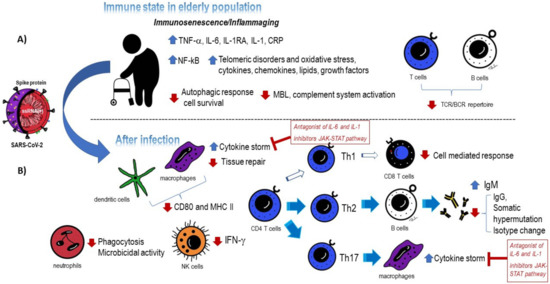 Immune state in elderly people and how SARS-CoV-2 infection affects immune system cells and soluble factors. (A) Several agents are involved in the physiological development of immunosenescence and inflammaging in elderly people. (B) A description of the different alterations that take place in elderly people after SARS-CoV-2 infection is shown. Antagonists of IL-6 and IL-1 and inhibitors of the JAK-STAT pathway are noted.