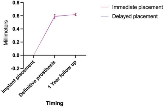 The overall insertion torque averaged 58.1 ± 14.1 Ncm. Insertion torques of 58.9 ± 13.8 Ncm and 59 ± 14.8 Ncm were achieved for post-extraction and for healed sites. The overall ISQ values averaged 73.6 ± 8.1. The ISQs for post-extraction and for healed sites were 72.3 ± 8.1 and 87.5 ± 6.8, respectively. No statistically significant differences were found for the insertion torque values and ISQ values in healed vs. post-extraction sites (p = 0.716 and p = 0.875) and in flap vs. flapless sites (p = 0.862 and p = 0.228), respectively. Higher values of insertion torque and ISQ were recorded in mandibular implants than in maxillary implants. Despite that, the difference did not achieve statistically significance (maxilla vs. mandible; insertion torque: 55.30 + 11.25 Ncm vs. 62.41 + 17.01 Ncm, p = 0.057; ISQ: 72.05 + 8.27 vs. 76.08 + 7.37, p = 0.058). A sub-analysis was performed concerning the implant lengths, diameter, and tooth position. The 14 mm-length implants had 56.7 ± 15 Ncm and an ISQ of 72.4 ± 8.3. The 12 mm-length implants had 61 ± 16.7 Ncm and an ISQ of 75.2 ± 6.9. The 16 mm-length implants had 87 ± 2.8 Ncm and an ISQ of 83.5 ± 7.7. The 4.5 mm Ø implants had 61.4 ± 14.9 Ncm and an ISQ of 74.8 ± 7.9, while the 4.0 mm Ø had 53.3 ± 9.6 Ncm and an ISQ of 70.4 ± 9.4. The 3.75 mm Ø had 52.9 ± 12.5 Ncm and an ISQ of 72.5 ± 7.6. The central incisors had 48 ± 5.5 Ncm and an ISQ of 72.7 ± 5.7, while the lateral incisors had 57.4 ± 13.3 Ncm and an ISQ of 73.9 ± 9.1. The canines had 59.2 ± 21.3 Ncm and an ISQ of 72.9 ± 6.5. At 1 year of follow-up, the mean overall MBL was 0.6 ± 0.1 mm; the MBL was 0.6 ± 0.4 mm and 0.6 ± 0.2 mm for post-extraction and healed sites, without any statistical significance between them (p = 0.385) (Figure 11). The mean total PES/WES value for the full set of patients was 16 + 1.85 (ranging from 12 to 19) at 1 year after the prosthesis was in function.