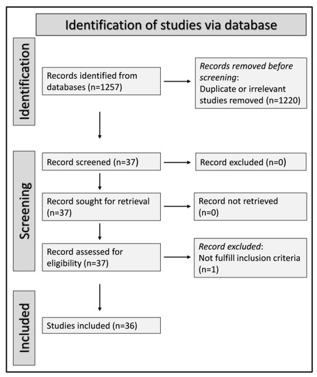 A total of 1257 articles were initially identified. Among them, 1220 were excluded because they were either duplicates or irrelevant. After a full-text review of the remaining 37 articles, one was further excluded because it did not fulfill the inclusion criteria, thus leaving 36 studies (9958 IPF patients, 78% males) for final analysis [21,22,23,24,25,26,27,28,29,30,31,32,33,34,35,36,37,38,39,40,41,42,43,44,45,46,47,48,49,50,51,52,53,54,55,56] (Figure 1). Fourteen studies were conducted in Japan [22,27,29,30,32,33,34,35,36,37,43,45,50,51], nine in the USA [21,25,31,38,41,46,47,48,49], three in France [44,53,54], three in Italy [26,52,56], three in China [28,39,42], two in South Korea [24,55], one in Ireland [23], and one in Saudi Arabia [40]. The reported clinical endpoints included mortality in 21 studies [21,22,23,24,26,29,30,32,33,37,38,39,40,45,49,50,52,53,54,55,56], disease exacerbation in 11 [22,23,25,27,28,31,34,37,41,46,55], disease progression in five [42,43,44,47,54], hospitalization in three [48,53,54], tolerability to the antifibrotic agent nintedanib in three [35,36,51], and incident pneumothorax in one [32]. Ten studies were prospective [25,26,27,28,30,43,44,46,53,54], while the remaining 26 were retrospective [21,22,23,24,29,31,32,33,34,35,36,37,38,39,40,41,42,45,47,48,49,50,51,52,55,56]. The baseline mean/median BMI values in these studies ranged between 21 and 30 kg/m2. Twenty-nine studies assessed the BMI as a continuous variable [21,22,23,25,26,27,28,29,30,31,32,33,34,35,37,39,40,41,43,45,46,47,48,51,52,53,54,55,56], six used cut-off values [24,36,38,42,44,49], and one assessed both [50]. Twenty-six out of 36 studies were published over the last five years [31,32,33,34,35,36,37,38,39,40,41,42,43,44,45,46,47,48,49,50,51,52,53,54,55,56] (Table 1).