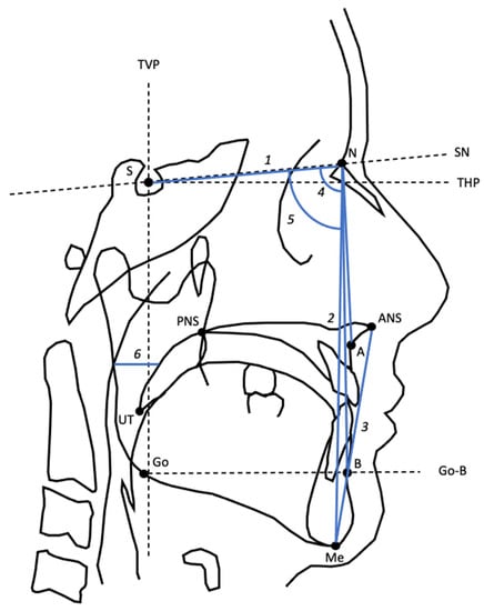 Landmarks, reference lines, and variables used from cephalometry. Landmarks: A, subspinale; ANS, anterior nasal spine; B, supramentale; Go, gonion; Me, menton; N, Nasion; PNS, posterior nasal spine; S, sella; UT, uvula tip; Reference lines: Go-B, gonion-supramentale; SN, sella-nasion; THP, true horizontal plane (through S, set at 7° from SN); TVP, true vertical plane (through S, set at 90° from THP). Variables: 1, S-N; 2, ATFH (anterior total face height, N-Me); 3, ALFH (anterior lower face height, ANS-Me); 4, SNA angle; 5, SNB angle; 6, SPAS (superior posterior airway space).