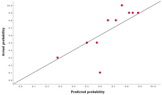 The performance of the prediction model was assessed in aspects of calibration and discrimination. Calibration is defined as the agreement between predicted and observed outcomes []. The calibration of the model was assessed with the calibration plot by plotting the predicted individual outcomes against the observed actual outcomes. The patients were grouped into deciles based on their predicted probabilities of the outcomes. The prevalence of the outcome events in each decile is considered the observed probability. The mean of the individual predicted probabilities in each decile is considered the predicted probability. In the calibration plot, the agreement between predicted probabilities and observed probabilities across the range of the predicted risks was estimated. The overall calibration of the model was assessed with the overall observed–expected ratio (O:E ratio) []. The O:E ratio was defined as the ratio between the prevalence of the outcomes (observed) and the mean individual predicted probabilities of the outcomes (expected) within the cohort []. An O:E ratio between 0.8 and 1.2 indicates an acceptable overall calibration []. The calibration of the model was also assessed with the Hosmer–Lemeshow goodness-of-fit statistic test (HL test). A p-value of >0.10 of the HL test indicates that the model fits the observed data [].