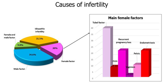 (Left panel): Main causes of infertility found in the 184 couples enrolled in this study. (Right panel): Detail of the main causes of female infertility.