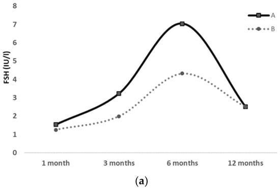 In healthy term neonates, FSH and LH rise from 1 week of age and peak between 1 and 3 months, stimulating sex hormone secretion. MP seems to reproduce the same sexual dimorphism previously exhibited in fetal life, with a greater increase in LH in males and FSH in females [3,4]. At approximately 6 months of age, LH and FSH start to decline, but FSH levels could remain high up to the age of 3–4 years in females [5,6]. Likewise, testosterone and estradiol peak at 1–3 months of age in males and females, respectively, and then decrease by 6 months of age [2,6,7,8]. Estradiol levels may sometimes fluctuate until 2 years of age, likely due to ovarian follicle cyclic maturation and atrophy [9,10].