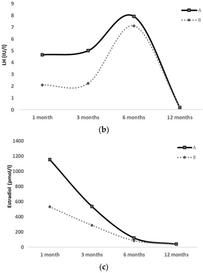 Figure 2. FSH (a), LH (b) and Estradiol (c) serum levels at 1, 3, 6 and 12 months of life in a pair of preterm twin girls; clinical pubertal signs were exhibited only by the first twin (twin A), whereas they were absent in the second twin (twin B) throughout the 12-month follow-up.