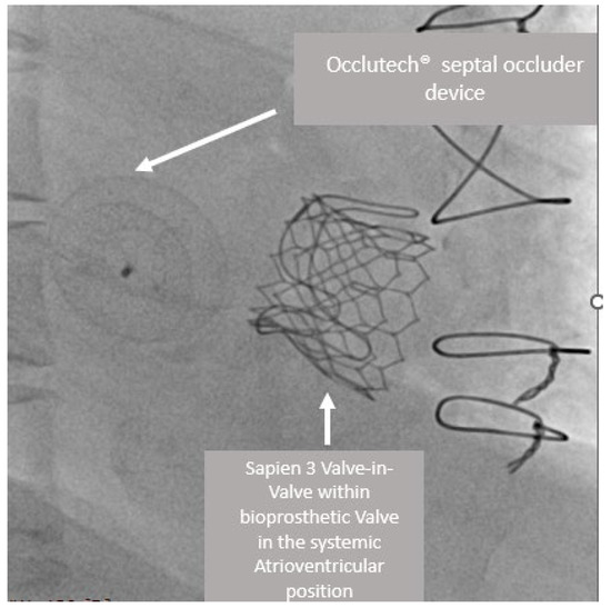 A female patient with congenitally corrected transposition of the great arteries had previously undergone replacement of the systemic AV valve with a Carpentier Edwards 25 mm bioprosthesis. She presented in the fourth decade of life with acute decompensated heart failure with severe structural deterioration of the bioprosthesis with mixed pathology of regurgitation and stenosis. On echocardiographic examination, the systemic ventricle had preserved systolic function, and the bioprosthetic valve had severe stenosis with a gradient of peak 45 mmHg with a mean of 20 mmHg as well as a flail leaflet with severe regurgitation. A Sapien 3 26 mm valve was inserted via femoral vein/transseptal access with hemodynamic improvement and residual minimal regurgitation and prosthetic patient mismatch with mild–moderate stenosis with an 8 mmHg mean pressure gradient. Due to a significant left-to-right shunt via the iatrogenic atrial septal defect and subsequent desaturation, an Occlutech® (Occlutech GmbH, Jena, Germany) septal occluder device 13.5 mm was inserted at the end of the procedure. This can be seen in Figure 1. The patient had a subsequent episode of atrial flutter and bradycardia, which was medically managed. She has not had a subsequent admission for heart failure and has been clinically well.