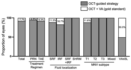 In the whole population, the retreatment decision based on anatomical criteria only (mostly OCT-guided) was same as the gold standard (i.e., OCT + VA) in 92.3% of cases. In the 11 cases (7.7%) where the addition of VA changed the retreatment decision, 6 eyes (4.2%) were finally not reinjected (PRN) or treatment was extended (TAE), and 5 eyes (3.5%) were reinjected (PRN) or treatment was shortened (TAE). Considering the specific subgroup analyses, adding VA to OCT led to different retreatment decision outcomes. According to the treatment regimen, the knowledge of VA changed the treatment decision in 4.8% of cases for PRN and 8.2% of cases for the TAE regimen. According to the fluid location, the knowledge of VA changed the treatment decision in 11.5% of cases for SRF only, 16.7% of cases for IRF only, 0% of cases for SRF + IRF and 0% of cases of SHRM only. According to MNV subtype, the knowledge of VA changed the OCT decision in 11.6% of cases for type 1 MNV, and in 0% for all other MNV subtypes. For late-stage nAMD (with VA ≤ 5 letters), the addition of VA changed the treatment decision in 50.0% of cases (Figure 1).