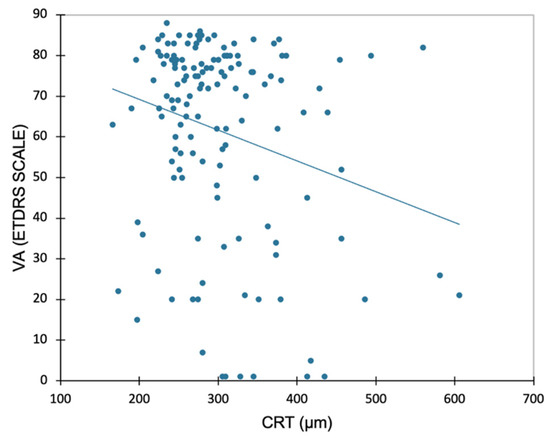 Linear regression plot for visual acuity (VA, ETDRS Scale) and central retinal thickness (CRT) at the study visit. Correlation analysis performed using Pearson’s test (r = −0.241; p = 0.004).