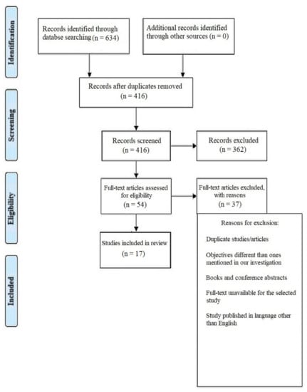 There was a total of 634 documents discovered after extensive search on the online journals and 416 of the papers were selected initially. Following that, 362 similar/duplicate articles were eliminated, which resultantly made 54 separate papers available at first. The abstracts and titles of submissions were then reviewed, and a further 37 papers were eliminated. Finally, 17 documents that met the requisite inclusion and exclusion criteria were chosen, which primarily included in-vitro studies, literature reviews and comparative assessments (Figure 1).