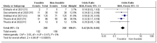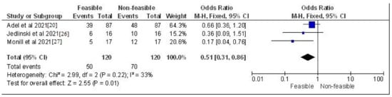 Odds ratio of systematic reviews which assessed the feasibility vs. non-feasibility rates of their respective trends represented on a forest plot after meta-analysis [20,26,27].