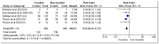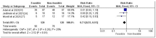 Risk ratio of systematic reviews which assessed the feasibility vs. non-feasibility rates of their respective trends represented on a forest plot after meta-analysis [20,26,27].