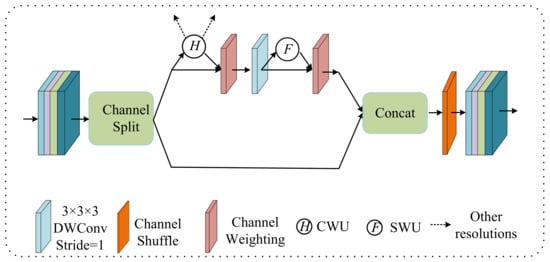 As shown in Figure 3, we used a cross-resolution weighting unit (CWU) instead of the first 1 × 1 × 1 convolution block in the shuffle block [38]. Firstly, the input feature map of the parallel multi-resolution branch was subjected to the adaptive average pooling (AAP) operation to make its resolution equal to the minimum resolution of the branch and concatenated in the channel direction. Global average pooling (GAP) was performed to compress the spatial features of the input feature map, and the compressed feature maps were subjected to a one-dimensional convolution operation with k kernel size to learn the importance of different channels. The value of k varied with the number of channels (C). The relationship between them can be written as [41]:
