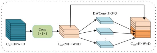 The fusion layer between stages in PMRNet is used for information interaction between multi-resolution branches. The traditional method is to use 3 × 3 × 3 convolutions with stride = 2 to downsample to reduce the resolution and use the nearest neighbor upsampling to increase the resolution, then use 1 × 1 × 1 convolution to implement dimensionality reduction. In order to avoid the high computational complexity problem caused by the fusion layer, we propose a lightweight multi-resolution fusion (LMRF) module. The structure of the LRMF module is shown in Table 3. We use a depthwise separable convolution (DWC) of 3 × 3 × 3 with stride = 2 to downsample. To solve the computationally intensive problem of a 1 × 1 × 1 convolution when increasing the resolution, we proposed a method that is similar to the Ghost module [42] to implement the same function as a 1 × 1 × 1 convolution. The structure is shown in Figure 4, firstly using a 1 × 1 × 1 convolution to generate a feature map with the number of channels as half of the number of output channels, and then the feature map of the required number of channels is generated by DWC and channel-wise concatenation. This method can achieve the same function as a 1 × 1 × 1 convolution and reduce feature redundancy.