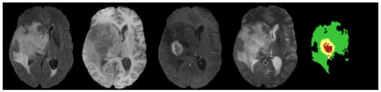 We evaluate our HMNet on three datasets [43,44,45]: (1) the BraTS 2018 dataset. It includes a training set of 285 samples and a validation set of 66 samples. (2) The BraTS 2019 dataset. It includes a training set of 335 samples and a validation set of 125 samples. (3) The BraTS 2020 dataset. It includes a training set of 369 samples and a validation set of 125 samples. Every sample in the training set includes four MRI modality images and a ground truth label, as shown in Figure 5. The size of the MRI images is 240 × 240 × 155 mm3, with the spacings among voxels are 1 × 1 × 1 mm3. The ground truth label includes enhancing tumors (label 4), peritumor edema (label 2), and necrotic and non-enhancing tumor cores (label 1). The validation results need to be uploaded to the online platform (https://ipp.cbica.upenn.edu/, accessed on 1 December 2022) for validation. The segmentation results can be divided into three classes: ET (label 1), WT (labels 1, 2 and 4), and TC (labels 1 and 4).