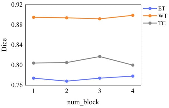 The Dice coefficients of the baseline with different num_block on the BraTS 2020 validation set.