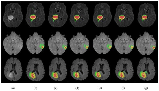 Visualization of segmentation results. Each row represents a different sample. (a) is the modality of Flair. (b–g) are the segmentation results of Network 1 to Network 5 in Table 8 and the ground truth. The yellow area is the enhancing tumor area. The red area is the necrosis and non-enhancing area. The green area is the edema area.
