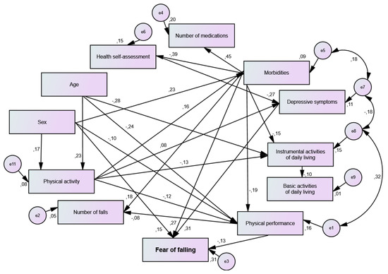 Thus, the data allow us to conclude that female sex, worse physical performance, a higher number of self-reported morbidities, and a higher number of depressive symptoms were directly associated with greater fear of falling. Additionally, older age, mediated by worse physical performance, as well as worse self-rated health, mediated by a higher number of depressive symptoms were associated with greater fear of falling.