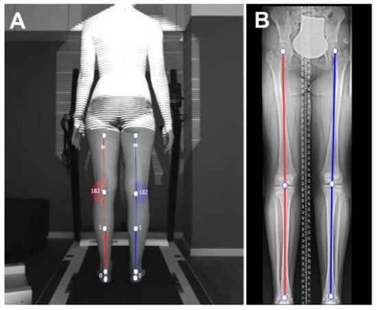 - Stief, F.; Feja, Z.; Holder, J.; van Drongelen, S.; Adolf, S.; Braun, S.; Böhm, H.; Meurer, A. Non-invasive determination of frontal plane lower limb alignment using motion capture technique—An alternative for full-length radiographs in young patients treated by a temporary hemiepiphysiodesis? Gait Posture 2020, 79, 26–32. [Google Scholar] [CrossRef] [PubMed]