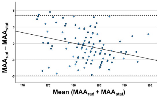 Statistical data analysis was performed with SPSS (version 27, IBM Corporation, Armonk, NY, USA). The Kolmogorov–Smirnov test confirmed non-normal distribution of the analyzed parameters. The Wilcoxon signed-rank test was used to test paired differences in MAA between LSX and MCA. The non-parametric Spearman correlation coefficient (rs) identified correlations between radiographic and marker-based measurements and the association of the BMI, body mass, height, age, and OA level. Correlations of rs below 0.3 were defined as low, 0.3 to 0.65 as medium, and above 0.65 as high. ANOVA was used to evaluate the regression coefficient. The significant level was defined as p ≤ 0.05. The Bland–Altman plot was used to directly compare and visualize the tested measurement techniques. Agreement between both methods and the potential bias were calculated and visualized.