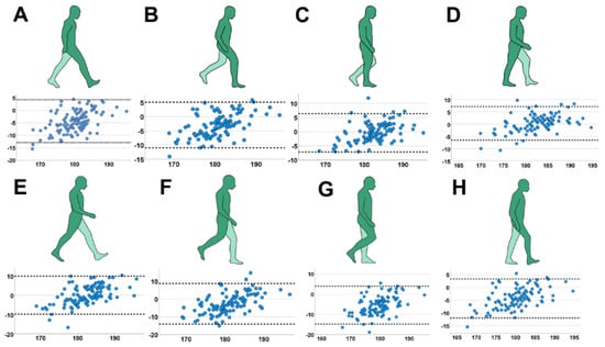 Leg axis analysis in specific gait cycles with Bland–Altman plot indicating systemic bias of the MAA (X-axis: mean MAA between static radiograph and marker-based measurement; Y-axis: difference in MAA between both techniques). (A) initial contact; (B) loading response; (C) mid- stance; (D) terminal-stance; (E) pre-swing; (F) initial-swing; (G) mid-swing; (H) terminal-swing.