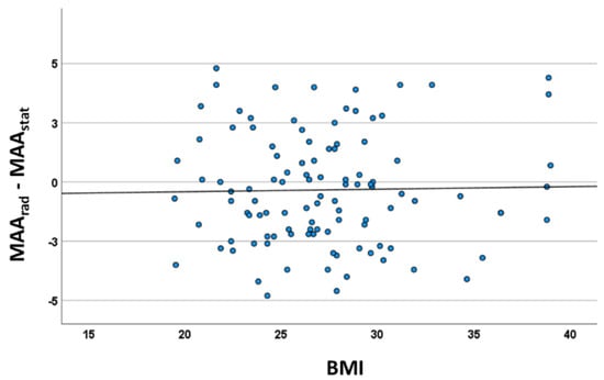 The body mass index was not associated with the difference between measurement methods (Figure 5; ß = −0.21; CI = −1.05–0.63°; p = 0.63)). The regression analysis of height (ß = −0.59; CI = −0.40–0.13°; p = 0.33), body mass (ß = 0.95; CI = 0.07–0.17°; p = 0.36) and gender (ß = −1.14; CI = −2.38–0.1°; p = 0.07) did not show any significant association with the systemic bias. Interestingly, a weak negative association could be detected for age (ß = −0.04; CI = −0.07–0.01; p = 0.007). The Kellgren–Lawrence score was either 0 or 1 among all subjects and did not affect any values of this outcome analysis.