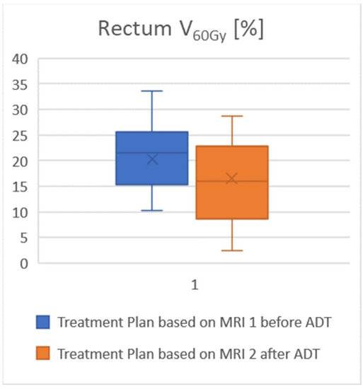 Attention to the reduction in prostate size after ADT by the updated MRI results in significant dose relief of the rectum. The proportion of the rectum exposed to more than 60 Gy is lower when treatment planning is performed using the current MRI 2.