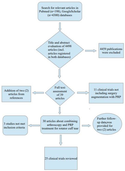 The search was performed through the PubMed and Google Scholar databases. The keywords and phrases used were “shoulder rotator cuff tear”, “PRP”, and “arthroscopy”. The search provided 4498 publications, including articles found in both databases. Thorough assessment of the articles was performed through search engine filters, as the search was further restricted in articles that included at least two of the keywords or -phrases in their title, were classified as clinical trials, and published during the time period described in the inclusion criteria. The remaining articles were screened by the authors after evaluating the titles and abstract texts available. Based on the above-mentioned criteria, 39 articles were chosen for a full-text assessment, and 28 articles referring to 26 different clinical trials [5,10,19,20,21,22,23,24,25,26,27,28,29,30,31,32,33,34,35,36,37,38,39,40,41,42,43,44] were identified. In addition, through references in the articles chosen, two more published clinical trials were identified [45,46], adding to a total of 30 articles referring to 28 different clinical trials. The flowchart summarizing the above search procedure is presented in Figure 1. After assessment of the full text of articles, one study was excluded [35] because of lack of a control group of patients reported in the study, while two studies [22,29] were finally excluded because they did not use any of the clinical scores investigated and provided no data on postoperative rotator cuff retears.